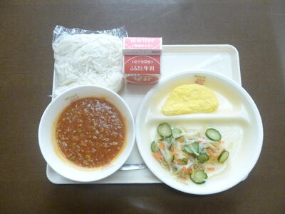 本日は、「ソフト麺」と「ミートソース」を一緒にして、食感も楽しみながら食べる献立になっています。