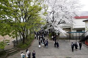 満開の桜の中、緊張の面持ちで、期待に胸を膨らませた新入生たちが東中生として初登校。