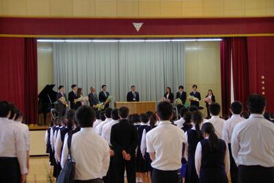 4月21日に離任式が行われました。昨年度、本校を離任された先生方からご挨拶をいただきました。