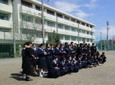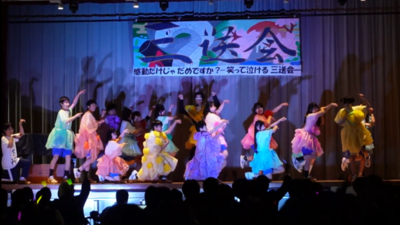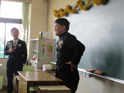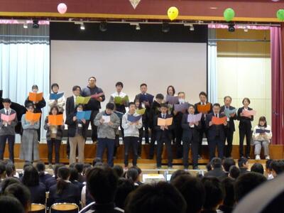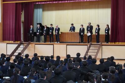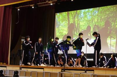 三送会実行委員と生徒会本部はオープニングライブを行い、1年生は3年生の思い出の劇で、2年生は部活動ごとによる動画と劇などの出し物で会場を大いに盛り上げました。サプライズで職員合唱も行われました。3年生も感謝の気持ちを出し物と歌で返しました。懐かしい写真と動画のスライドショーで3年間を振り返ったあとは3年生から3年生の先生方へ感謝の気持ちを伝えるサプライズが行われました。最後はくす玉を割り、笑いと感動が溢れる3年生を送る会でした。